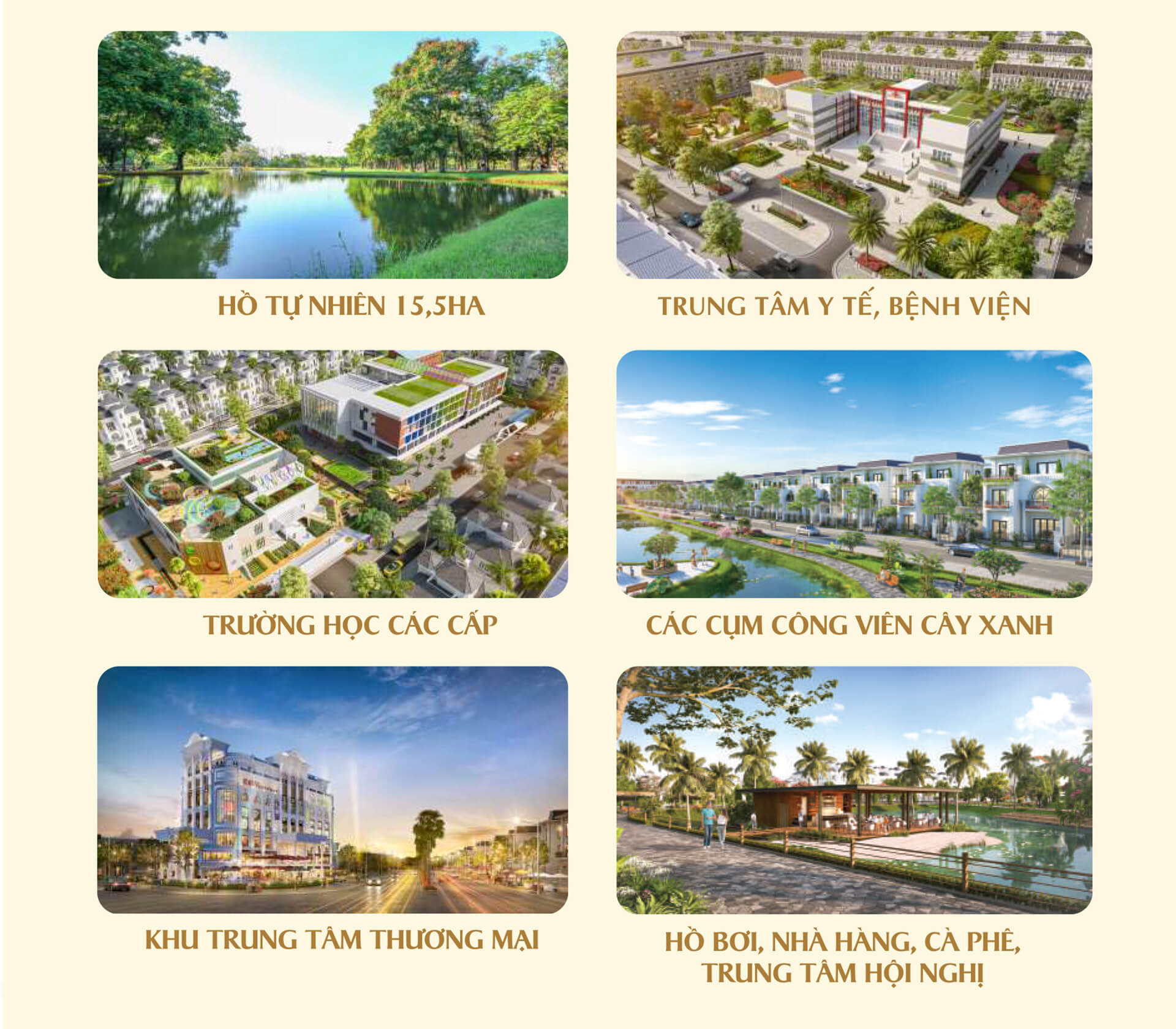 Dự án tích hợp trung tâm thương mại, công viên đi bộ, hồ nhân tạo, trung tâm y tế, trường học các cấp, trung tâm thể thao, spa, nhà hàng, cafe, và thậm chí là đảo nổi độc đáo – tất cả tạo nên một môi trường sống toàn diện “all-in-one” cho cư dân.