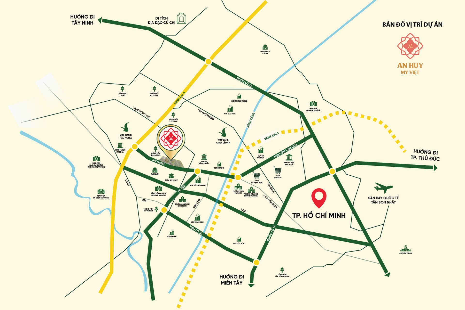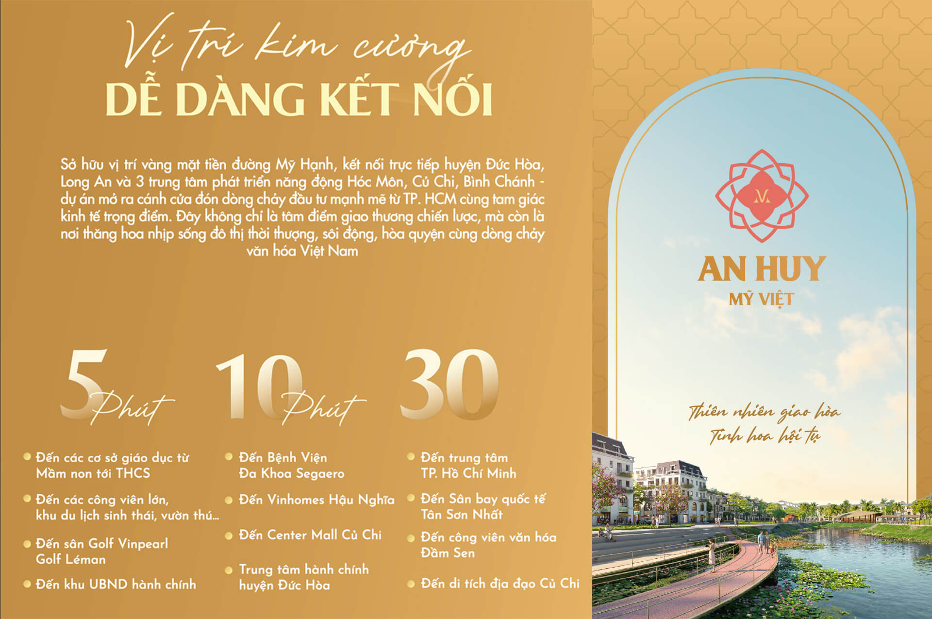 Tọa lạc ngay cửa ngõ Tây Nam Bộ, An Huy Mỹ Việt giữ vị thế đắc địa, kết nối linh hoạt đến trung tâm TP. Hồ Chí Minh, khu đô thị mới Tây Bắc, Đức Hòa – Long An và các trục phát triển kinh tế quan trọng như Vành đai 3, Vành đai 4, Quốc lộ 1A, Quốc lộ 22 và Tỉnh lộ 10.